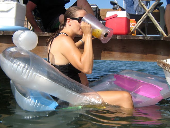 The idea was to build a bridge of floaties from shore to the deck next to the host's sailboat.